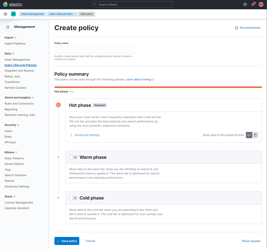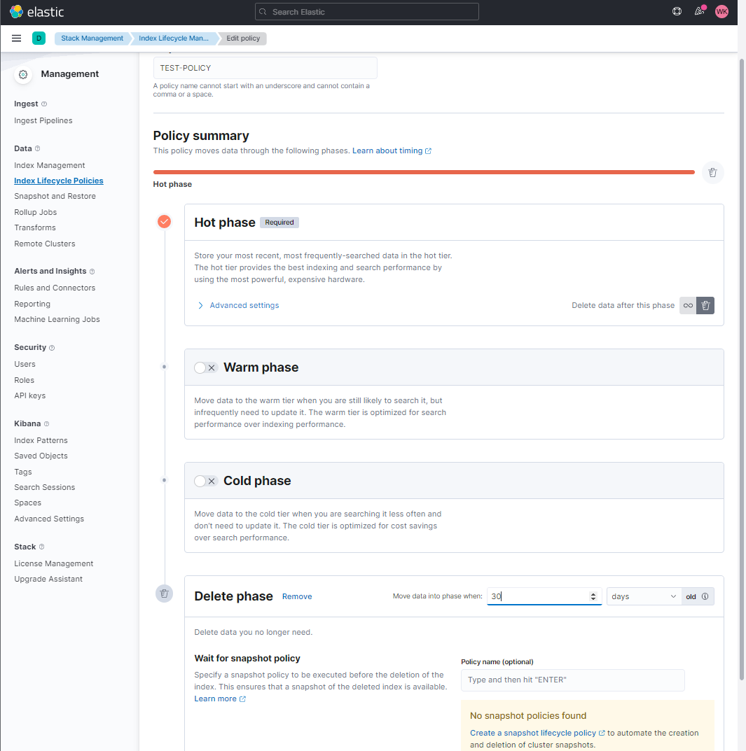 그러면 위와 같은 화면이 뜨게 되고... 뭐... 그다음에는 설명이 잘 되어 있으므로 클릭, 입력, 클릭, 입력을 반복하면 된다. 예를 들어 "TEST-POLICY"라고 이름을 정하고 Hot Phase에서 30일 후, 삭제 같은 경우에는