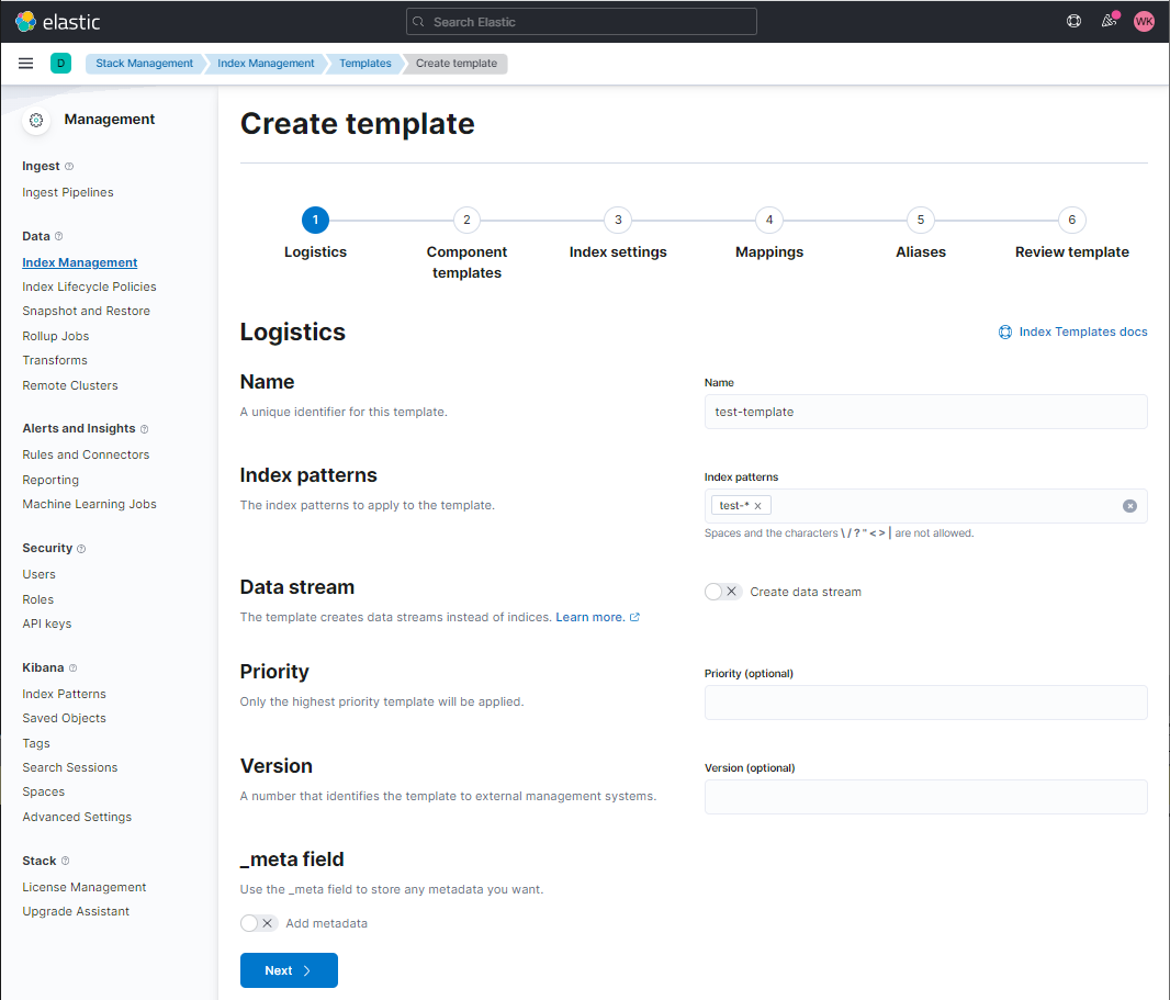 그러면 위와 같은 템플릿 생성창이 뜨고, 이름과 인덱스 패턴을 입력하고 다음을 누르면 된다. 주의해야 할 사항은 인덱스 패턴인데, 해당 인덱스 패턴은 데이터 입력, ILM 동작시 모두 중요한 역할을 하게 된다.